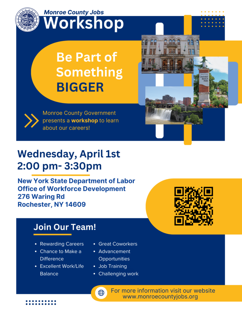 DOL Workshop 4.1.26 Presentation Flyer shows information for an upcoming workshop through Monroe County. This event will be on Wednesday April 1st from 2pm-3:30pm at 276 Waring Rd. Please see the attachment for more information.