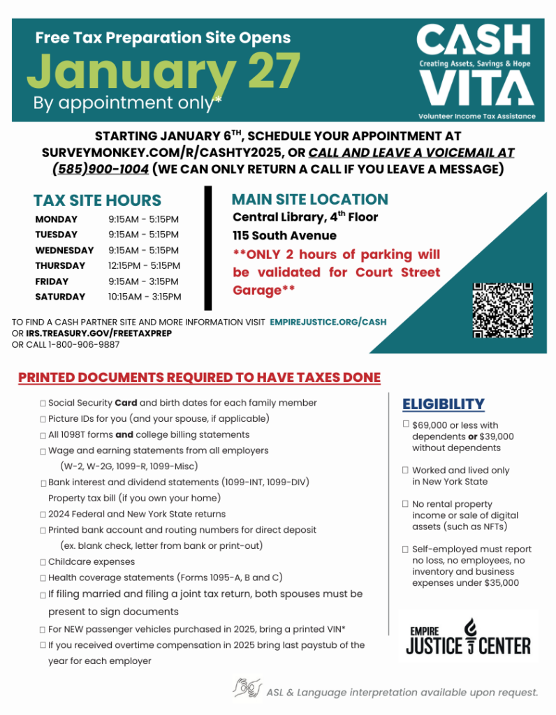 - Free Tax Preparation: CASH is offering their yearly free income income tax preparation. Please see the attached fliers for more information (including what to bring to the appointment!) Appointments are currently open and can be made by clicking on this link!
